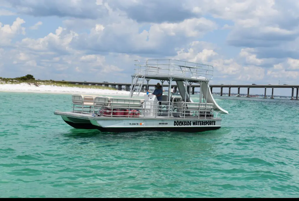 DOUBLE DECKER PONTOON RENTALS IN DESTIN are now available for rent here at Dockside Watersports! Have a larger party that wants built in entertainment? This is the perfect vessel for parties of up to 12 people. This Destin pontoon rental features two levels complete with 2 slides, plenty of seating for everyone, a stereo system to include bluetooth connectivity, and a 115 HP Yamaha motor.